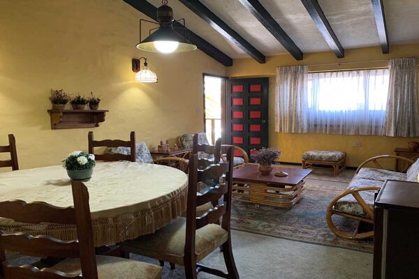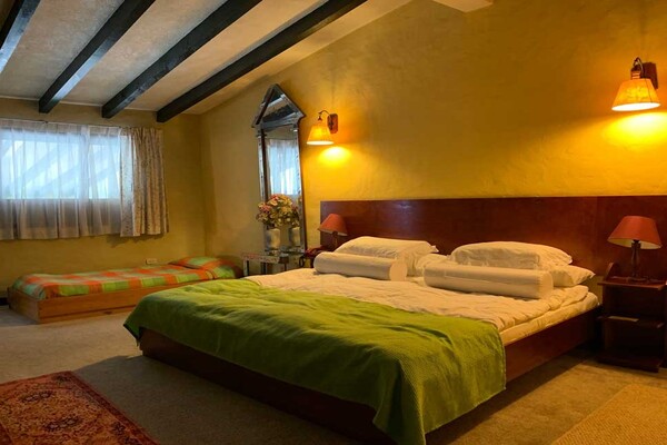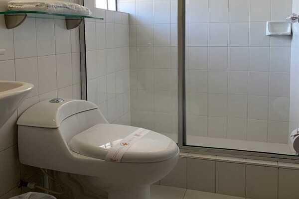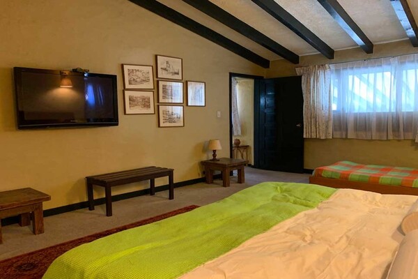 Amplia y cómoda habitación con dos ambientes diferentes : 1 cama doble y una cama sencilla, 2 baños privados con agua caliente, sala y comedor.